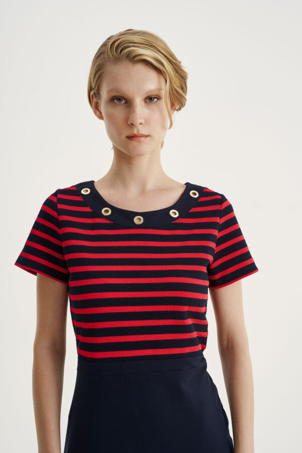 Elegant and timeless dress made of knitted viscose fabric Short sleeves Rounded neckline Knee length Stund details at the neckline Matching cardigan for a twin-set outfit Greek design and manufacture