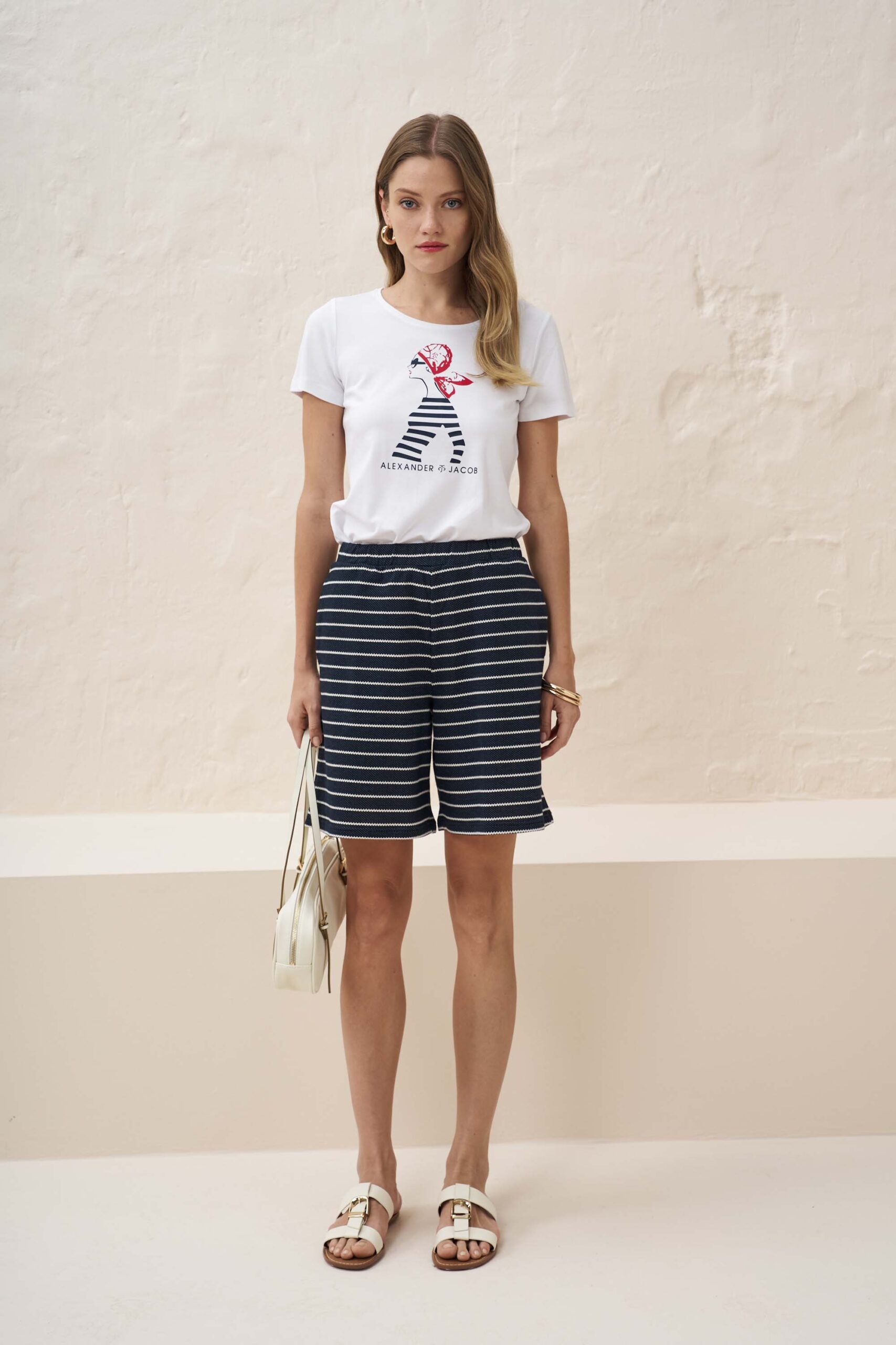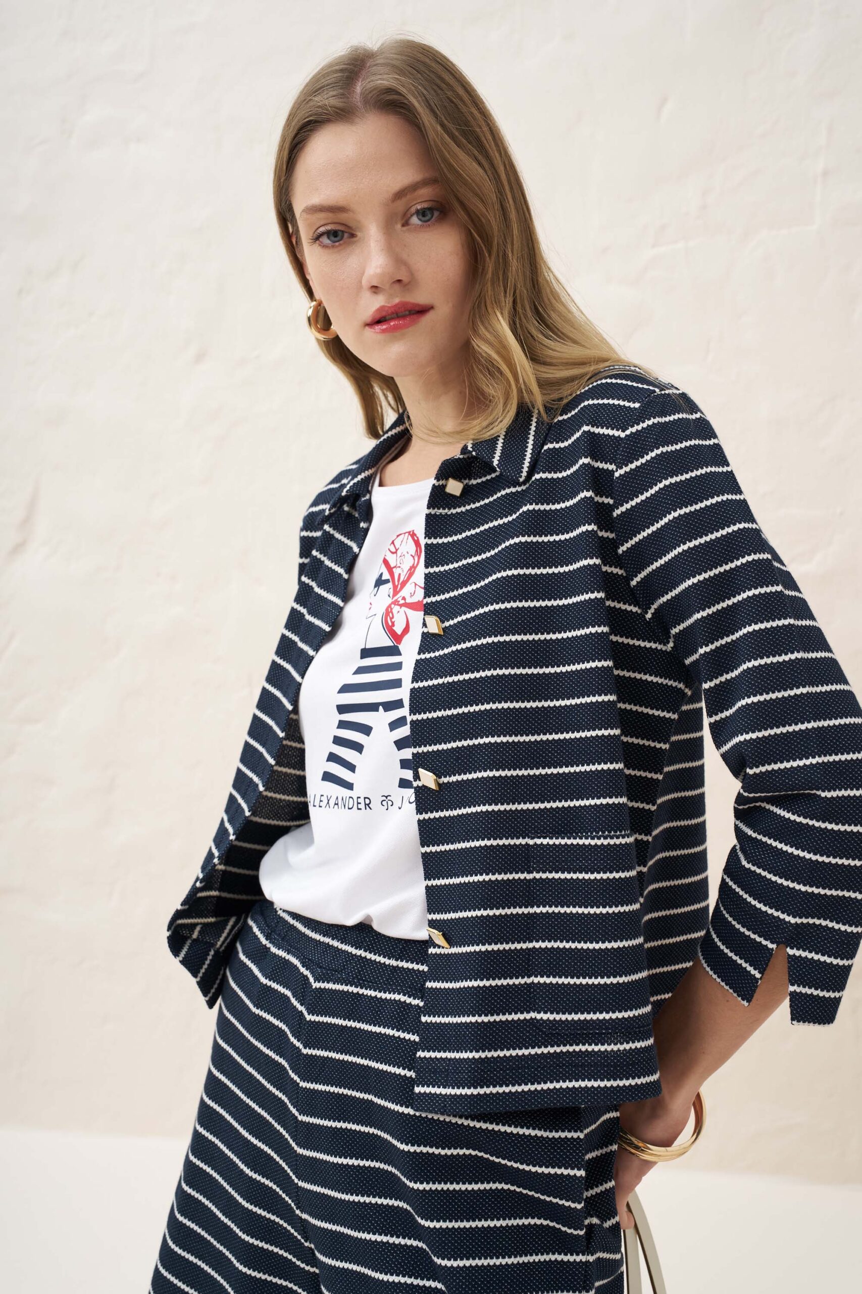 Romantic blouse made of knitted viscose fabric with navy girl print
