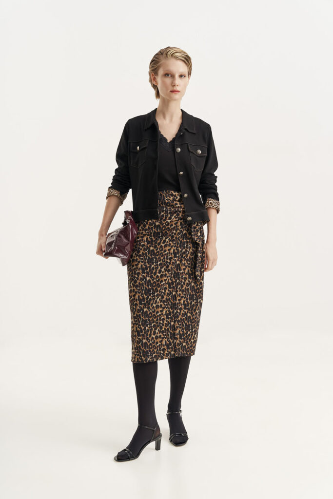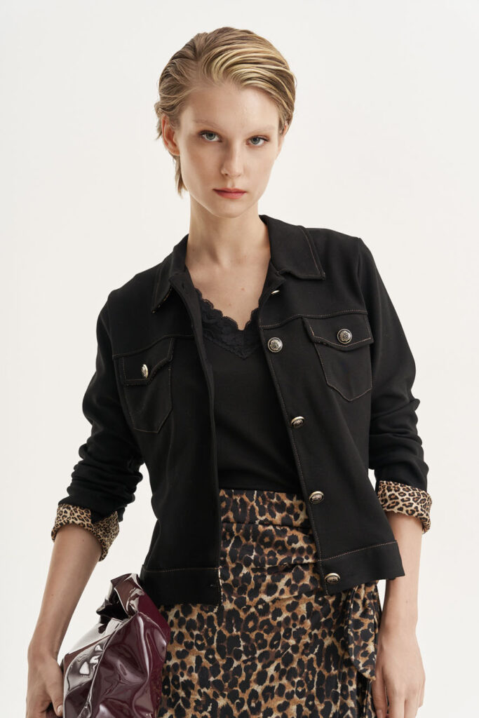 Το jacket με τις animal print αντιθέσεις αποτελεί το απόλυτο κομμάτι της σεζόν. Δοκίμασέ το με μαύρη μπλούζα και ένα παντελόνι σε στενή γραμμή ή φούστα. Οι μπαλαρίνες ή χαμηλές γόβες θα προσθέσουν κομψότητα, ενώ μπορείς να ολοκληρώσεις το look με διακριτικά σκουλαρίκια ή ένα minimal κολιέ. Η ισορροπία ανάμεσα στο έντονο μοτίβο και το διαχρονικό αυτό κομμάτι είναι το κλειδί για ένα αρμονικό αποτέλεσμα. Ιδανική επιλογή για μια βόλτα στην αγορά ή για καφέ ακόμη και για μια χαλαρή βραδινή έξοδο.